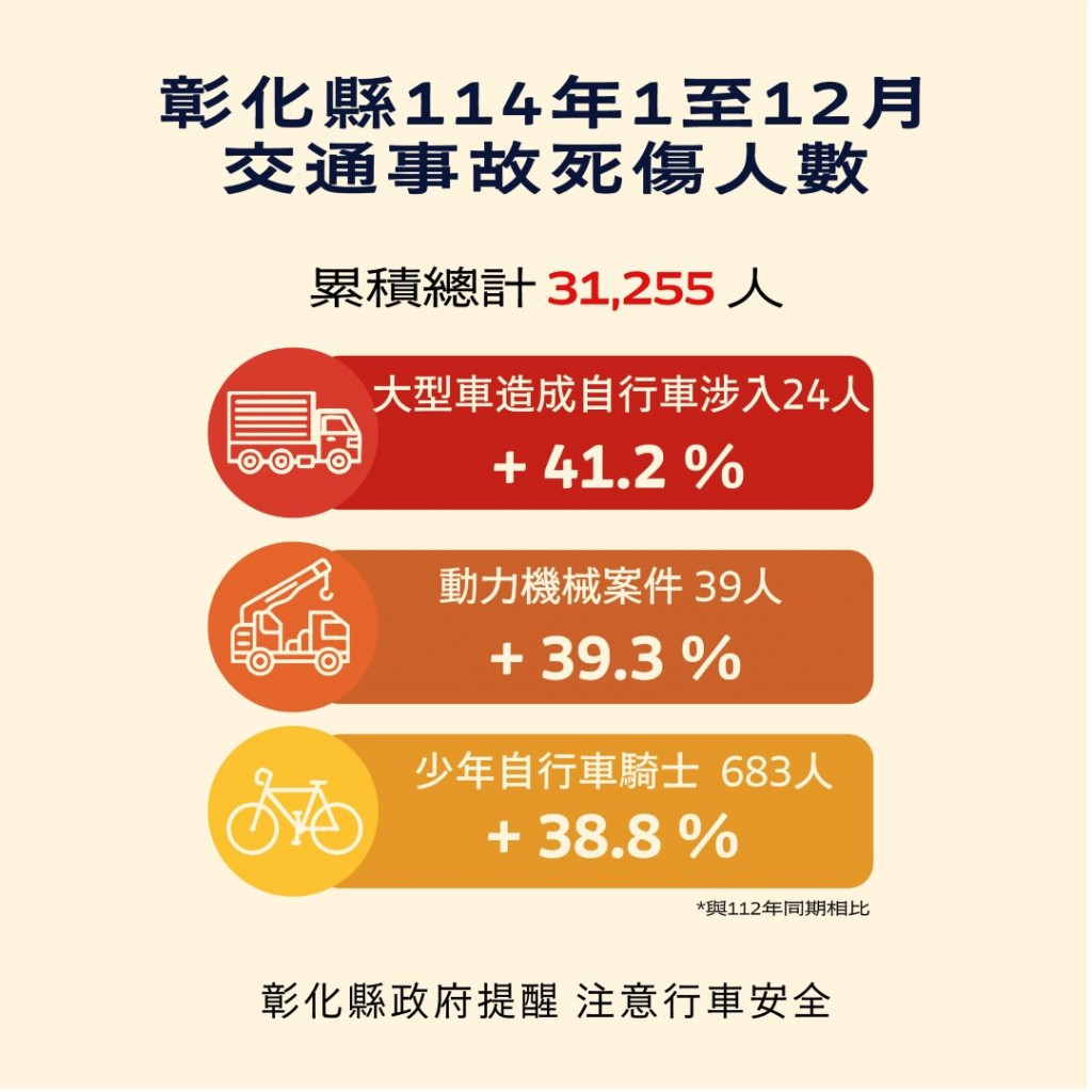 | 根據交通部道安資訊查詢網,本縣114年1-12月道路交通事故與112年同期比較分析,以大型車造成自行車涉入(含電自、電輔)事故增加41.2%最高, 動力機械案件 增加39.3%次之。少年自行車騎士(含電自、電輔) 增加38.8%再次之。1-12月份鄉鎮市30日死亡人數於「彰化市、員林市、鹿港鎮」為多,肇事熱點以「彰化市」為多,合先敘明。 |