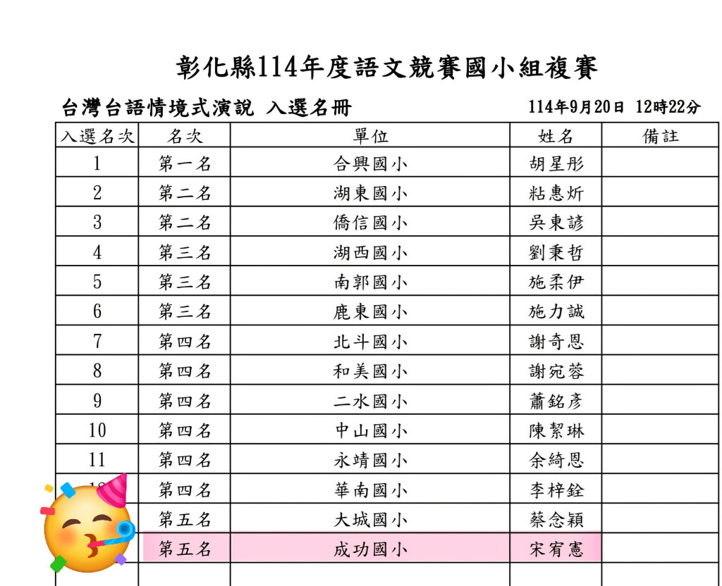 宋宥憲 同學,參加彰化縣114年度語文競賽國小組複賽,榮獲 臺灣台語情境式演說 全彰化縣第五名