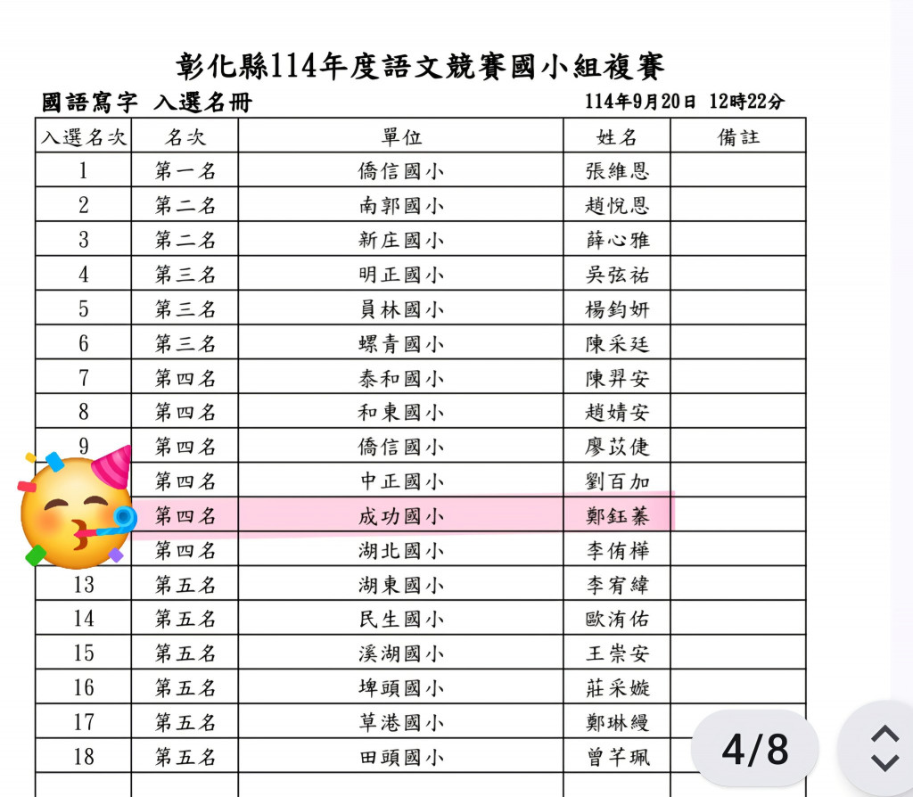 賀 鄭鈺蓁同學,參加彰化縣114年度語文競賽國小組複賽,榮獲 寫字 全彰化縣第四名